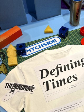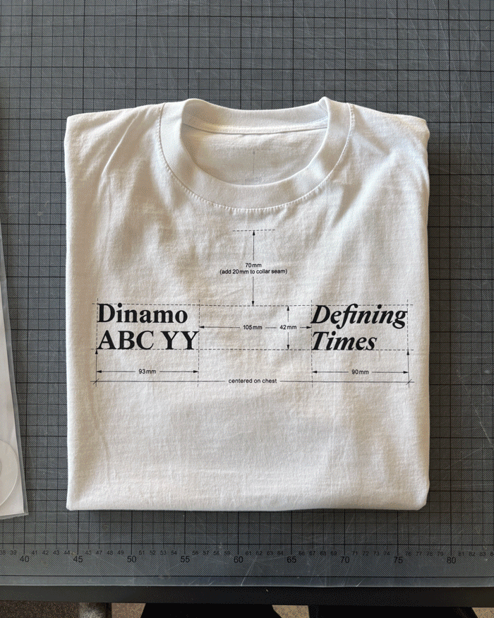 This one is called Defining Times, because of what the moment felt like, and as an excuse to take the concept literally: the graphic contains its own measurements and placement instructions. The shirt is the instruction and the instruction is the shirt. It remains unclear how this lil’ joke landed at the print shop.